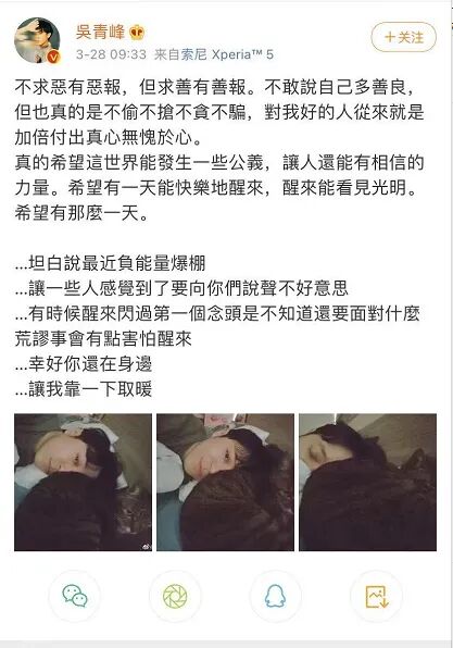 张韶涵转发了吴青峰在30日开庭前两天更新的动态,当时吴青峰的动态写到,“不求恶有恶报,但求善有善报。不敢说自己多善良,但也真的是不偷不抢不贪不骗,对我好的人从来就是加倍付出真心无愧于心。真的希望这世界能发生一些公义,让人还能有相信的力量。希望有一天能快乐地醒来,醒来能看见光明。希望有那么一天。”
