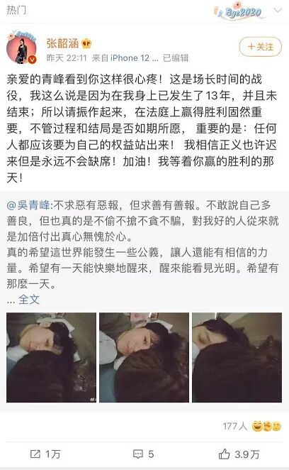 张韶涵则在转发时评论到,“亲爱的青峰看到你这样很心疼!这是场长时间的战役,我这么说是因为在我身上已发生了13年,并且未结束;所以请振作起来,在法庭上赢得胜利固然重要,不管过程和结局是否如期所愿, 重要的是:任何人都应该要为自己的权益站出来! 我相信正义也许迟来但是永远不会缺席!加油!我等着你赢的胜利的那天!”